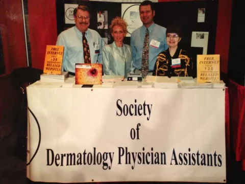 1996-1997 President, Kurtis Opp; Vice President, Jim Sotack; Secretary/Treasurer, Sue Rancis; Board Members: Esther Cohen, Terri Beck, Linda Findley, and Debbie Hauser; Executive Secretary, Mary Monroe. • Kurtis Opp, SDPA President, prioritizes formal assembly for dermatology PAs, presents bylaws, and starts to form a relationship with the American Academy of Dermatology (AAD). • SDPA staffs first booth at the AAD Annual Meeting in Washington, D.C. to educate dermatologists about physician assistants in dermatology. • SDPA dues are increased to $50/year. |