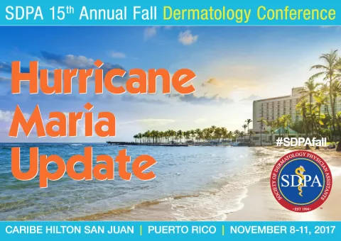 As you know, Puerto Rico suffered a direct hit from Hurricane Maria on Wednesday of this week. Over the past couple of days the SDPA Headquarters, Conference Committee Leaders and Board of Directors have been inundated with messages from SDPA members, industry representatives, and speakers seeking information on the status of our 15th Annual Fall Dermatology Conference in San Juan this November. Our liaisons at the Hilton properties in San Juan are currently assessing the situation, but don’t yet have a final assessment of the properties and utilities since it has only been a couple of days since the hurricane passed.